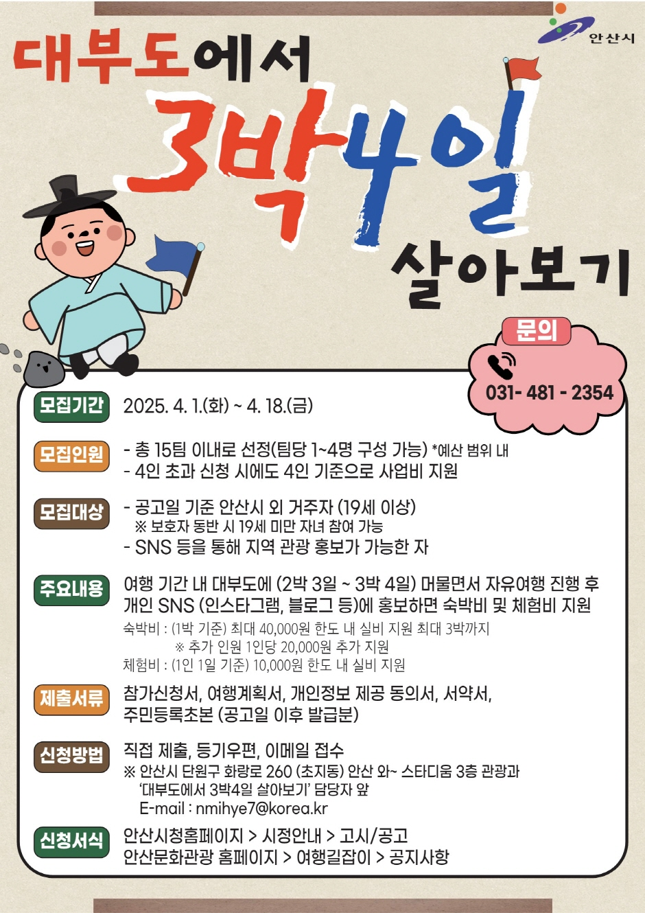 안산시 대부도의 우수한 관광자원을 널리 홍보하고 체류형 여행 분위기 확산을 위해 실시하는 「2025년 대부도에서 3박4일 살아보기」 참가자를 아래와 같이모집하오니, 많은 관심과 신청 부탁