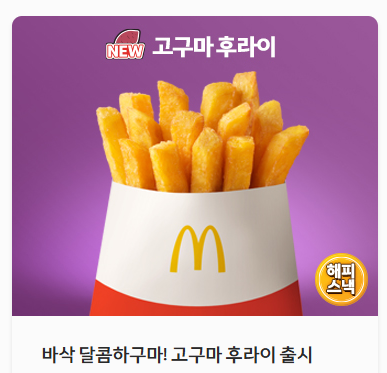 맥도날드의 인기 사이드 메뉴였던 ‘고구마 후라이’가 많은 팬들의 요청에 힘입어 다시 한정 출시되었습니다! 기존 감자튀김과는 다른 달콤하고 바삭한 고구마 맛을 즐길 수 있어, 특히 디저트 또는 간식으로 많은 사랑을 받았던 메뉴입니다.
