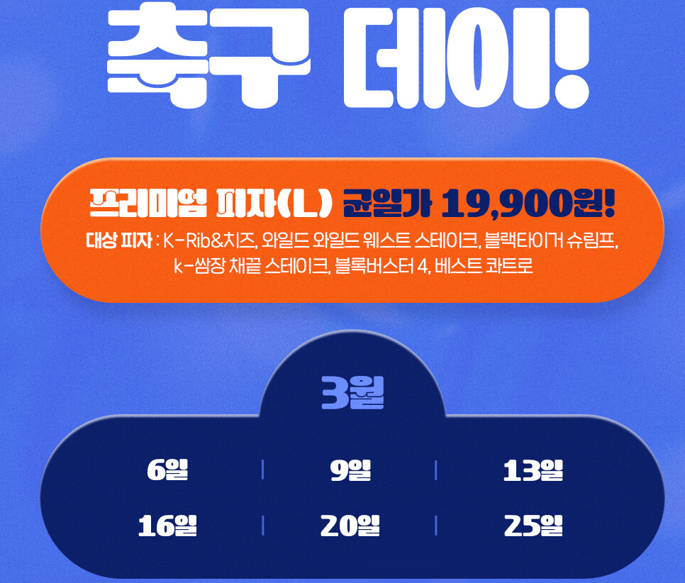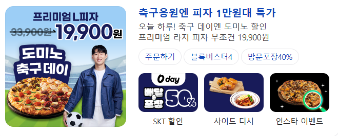 도미노 피자가 35주년 기념으로 월드컴예선 축구데이 50% 할인 주문행사를 합니다.