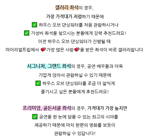 - 갤러리(Gallery): 비교적 저렴한 좌석으로, 처음 관람하거나 가성비를 추구하는 관람객에게 추천.