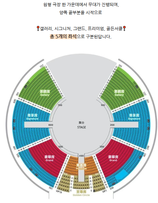 - 프리미엄(Premium) & 골든 서클(Golden Circle): 공연을 한눈에 담을 수 있는 최고의 시야를 제공.