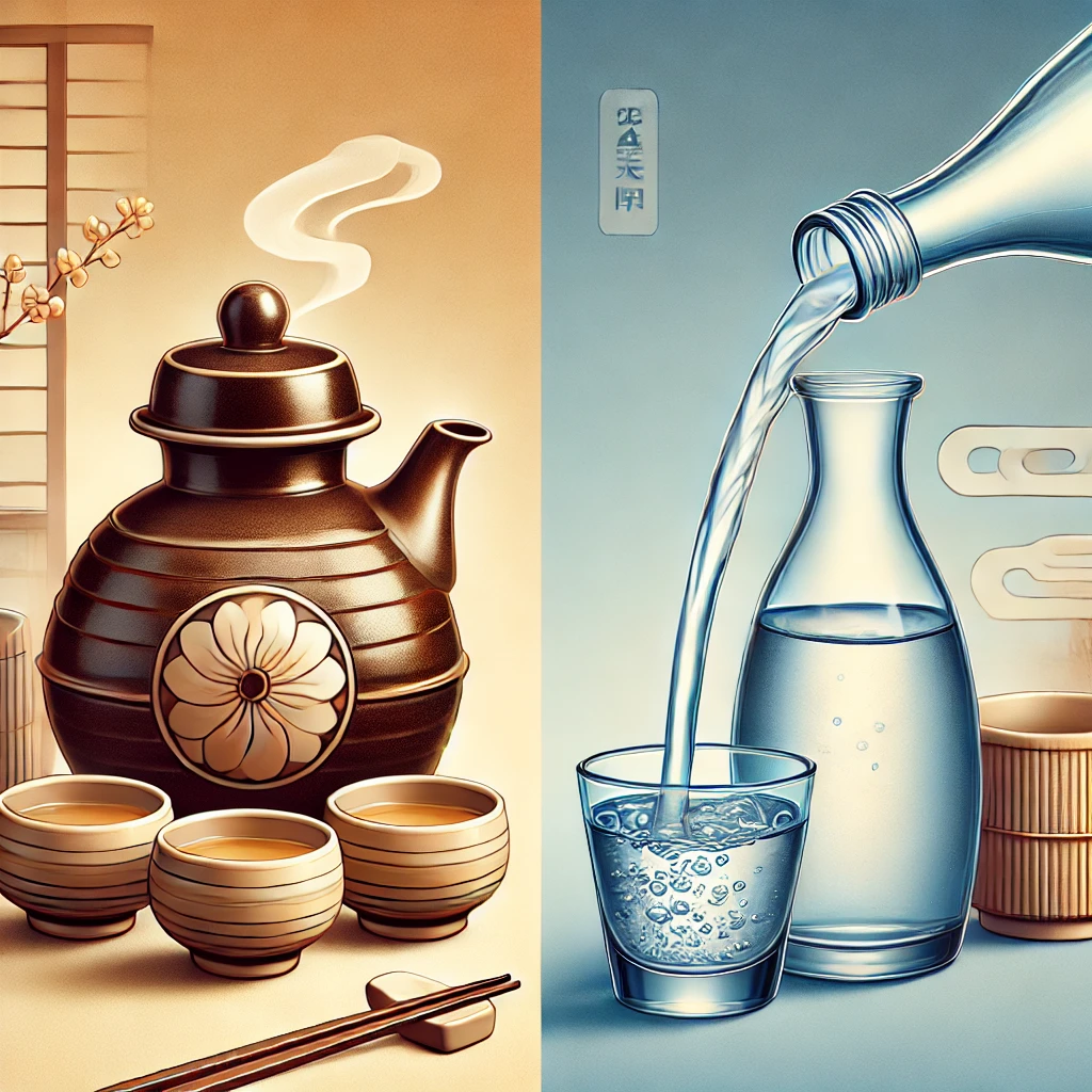 여기 정종과 사케의 대비점을 상징하는 이미지입니다! 🍶 왼쪽은 따뜻한 정종(기쿠마사무네 스타일), 오른쪽은 차갑게 마시는 일본 사케를 표현했습니다. 한국과 일본의 문화적 차이를 시각적으로 담아봤어요. 😊