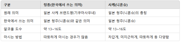 - 즉, 한국에서 말하는 "정종"은 특정 브랜드명이었지만, 이후 일본 청주(사케) 전체를 가리키는 말로 쓰이고 있습니다.