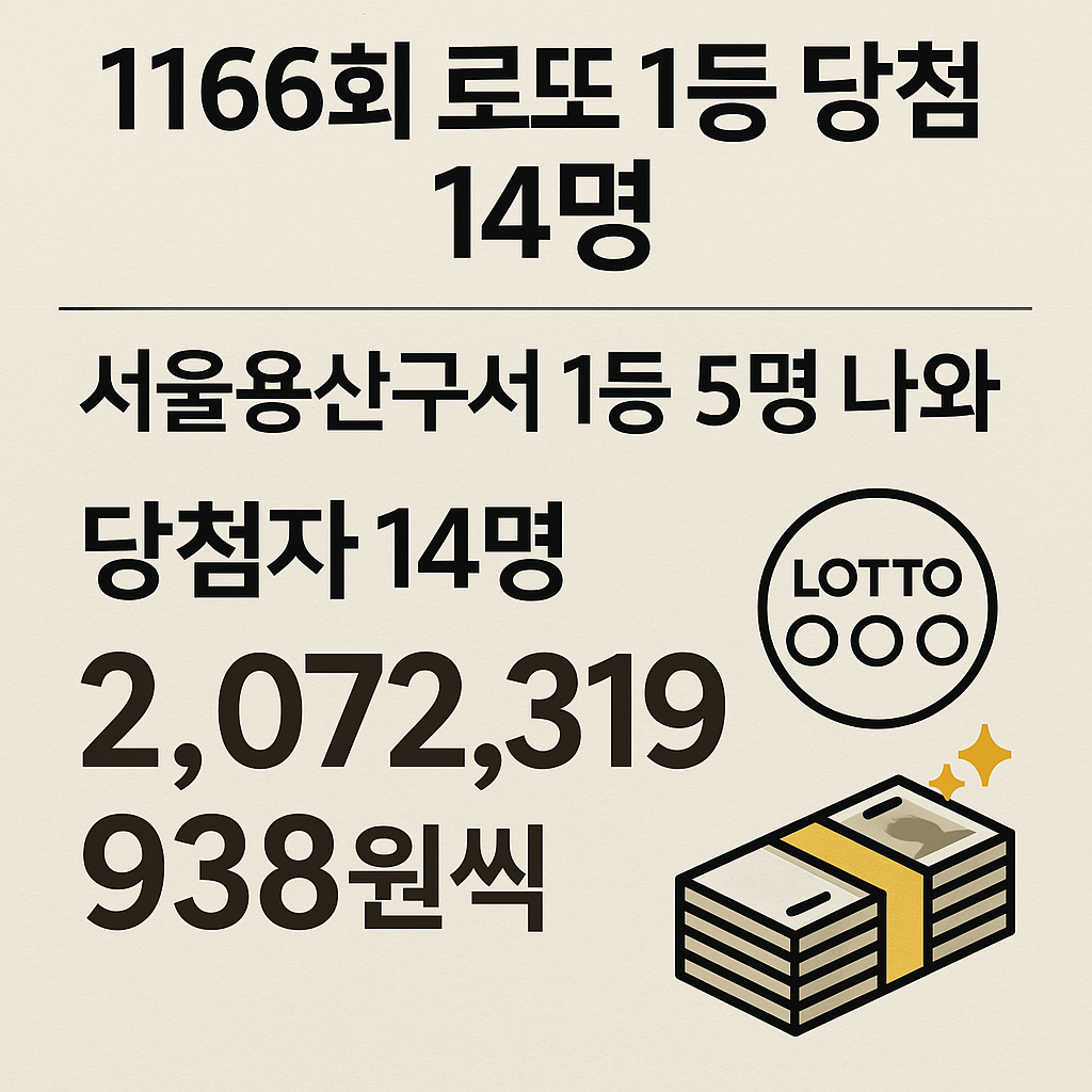 2025년 4월 5일 추첨된 1166회 로또에서 1등 당첨번호는 14, 23, 25, 27, 29, 42이며, 2등 보너스 번호는 16으로 결정되었다. 1등 당첨자는 총 14명으로, 각 2,072,319,938원씩 받게 된다.