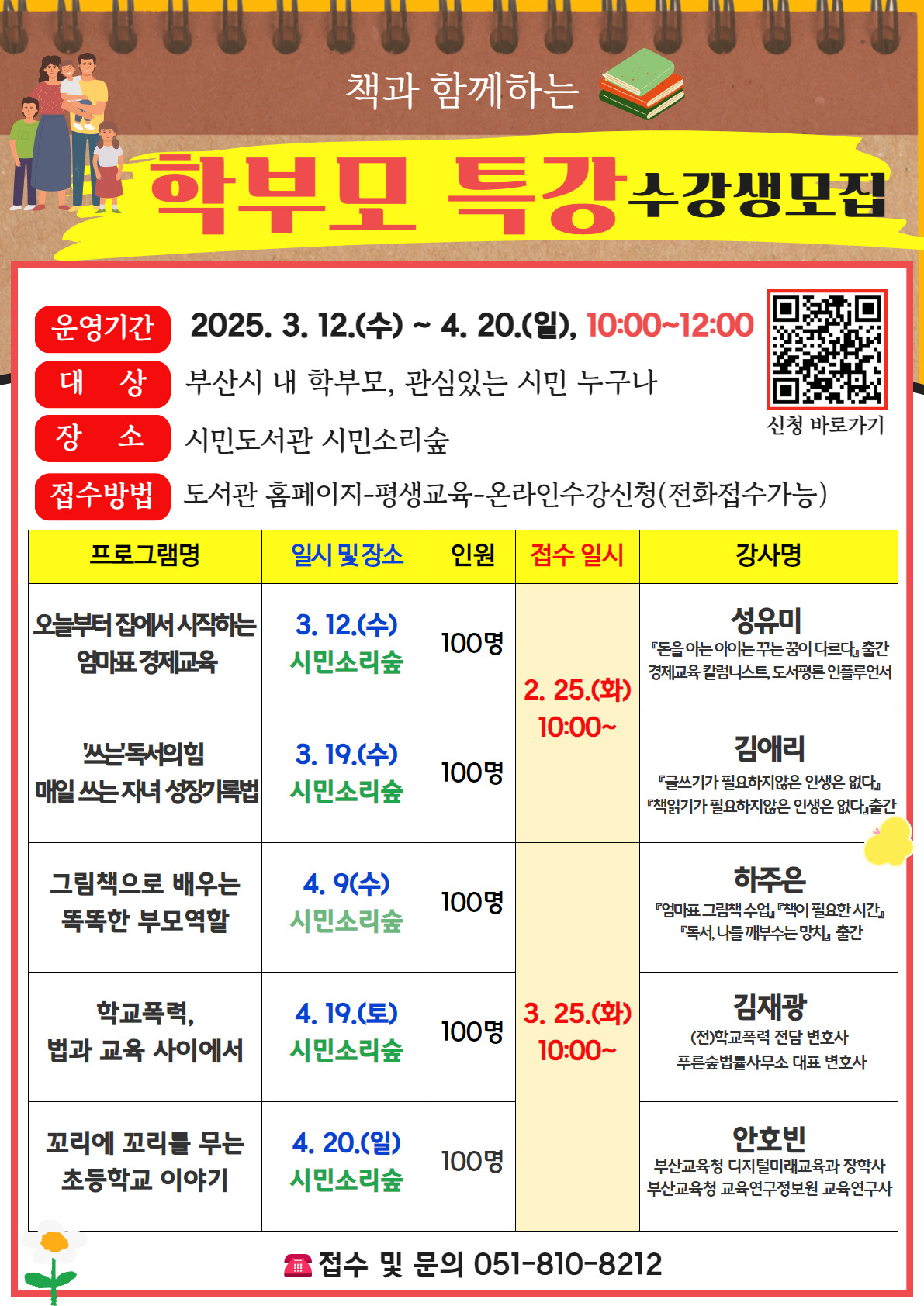 2025년도 시민도서관 학부모 특강 수강생 모집을 안내합니다.