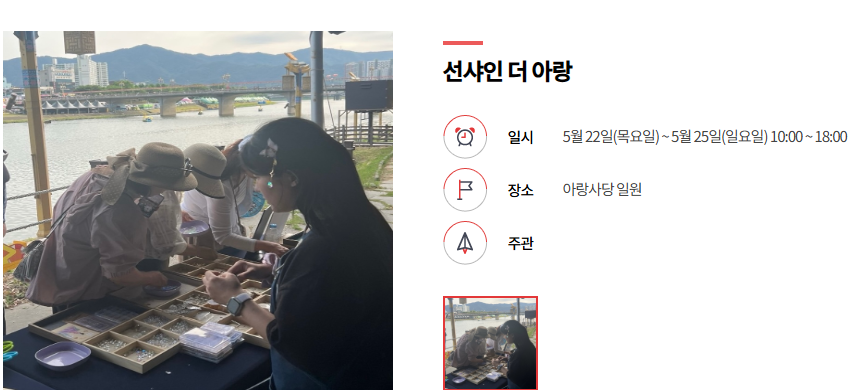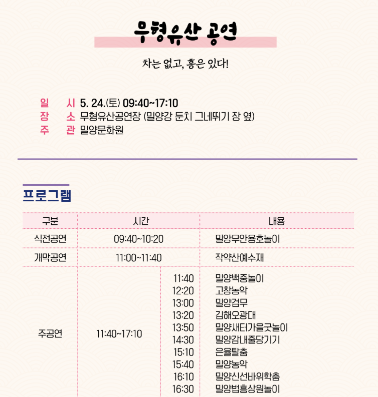 - 장소: 밀양강 둔치, 영남루, 삼문송림 등 밀양시 일원