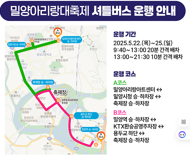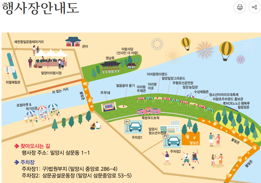- **밀양역(KTX)**에서 도보 15분 거리 축제장!
