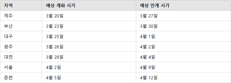 지역별로 벚꽃의 개화와 만개 시기는 다음과 같이 예상됩니다: