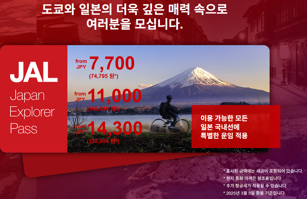 - JAL Japan Explorer Pass: 외국인 전용 요금제로 도쿄-오사카 기준 약 5,500엔으로 국내선을 이용할 수 있습니다.